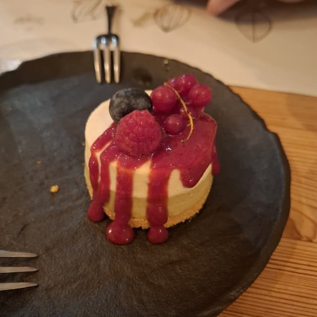 Grazie a questa cheesecake abbiamo finito in bellezza la cena da Nativa. La base è di biscotti e fritta secca con una puntina salata, poi c'è uno strato al pistacchio che sa veramente di pistacchio e uno strato al cioccolato bianco leggermente vanigliato, entrambi buonissimi, dalla consistenza morbida e non troppo dolci. La colata di salsa ai frutti rossi si sposa perfettamente con il resto dei sapori