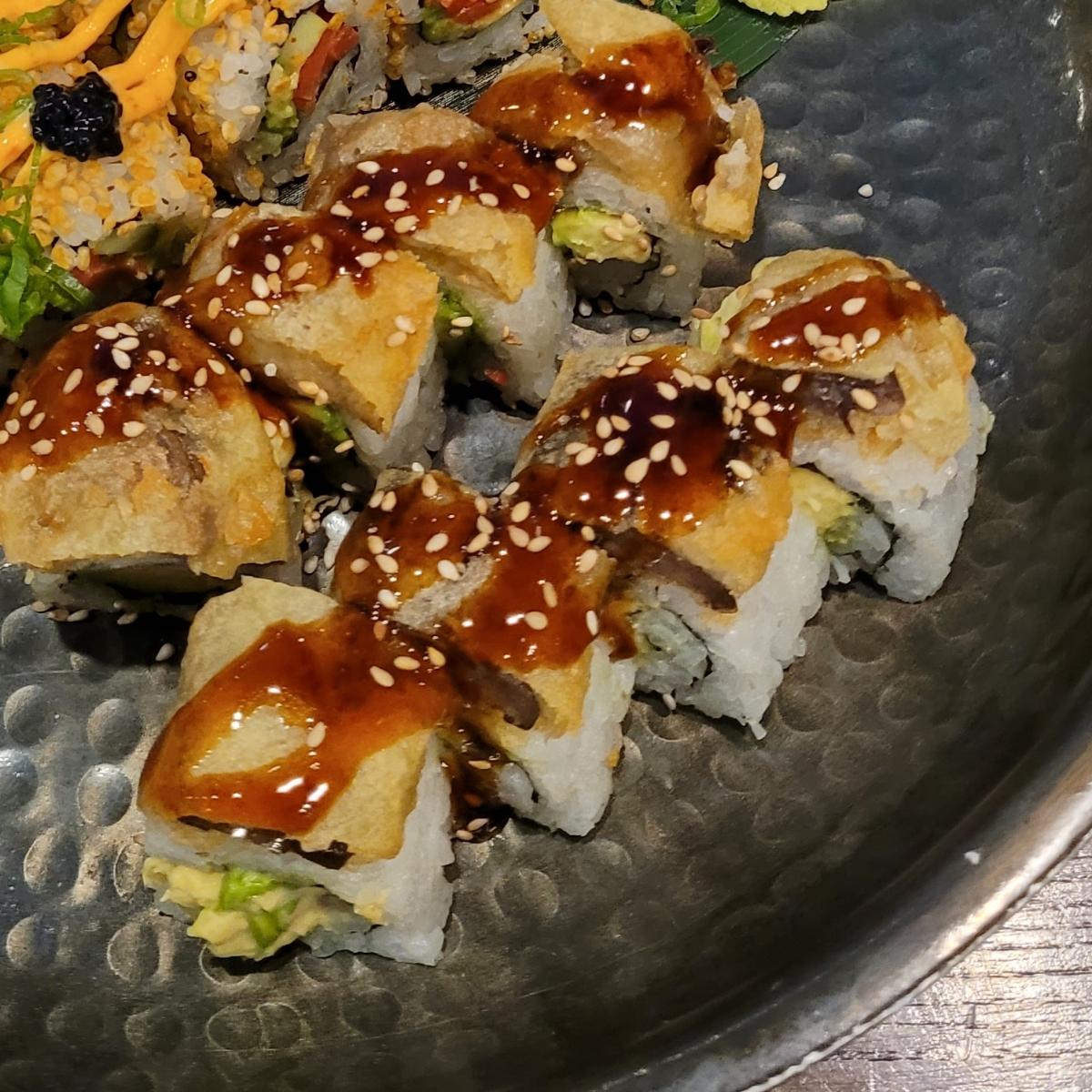 Love this #sushiroll and I get it nearly every time I come here! I appreciate that Blue Sushi Sake Grill has a huge vegan selection and it's not just basic veggie rolls, they really put in some effort to make tasty, beautiful, and unique rolls. This prince roll is 8 pieces and contains #eggplant #tempura, #avocado, and #sweetsoysauce. It's more simple than some of their other rolls, but the flavors work well together and I love the creaminess of the avocado next to the tempura.