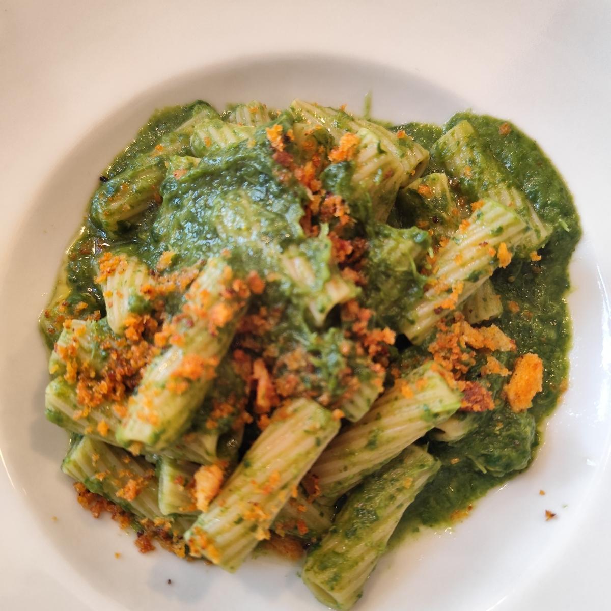 Pasta con crema di cime di rapa, peperone crusco e pane tostato senza infamia e senza lode. Mi aspettavo un qualcosa in più ma è una pasta molto semplice che non rimane impressa e che è facilmente ripetibile a casa