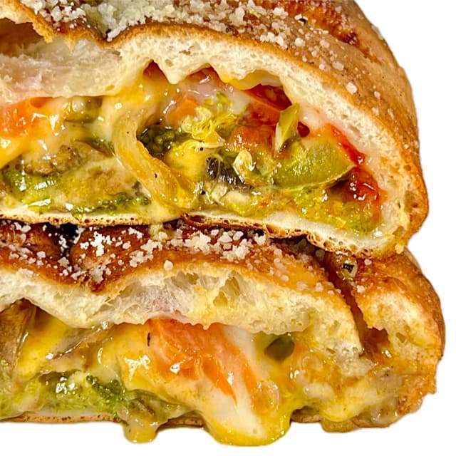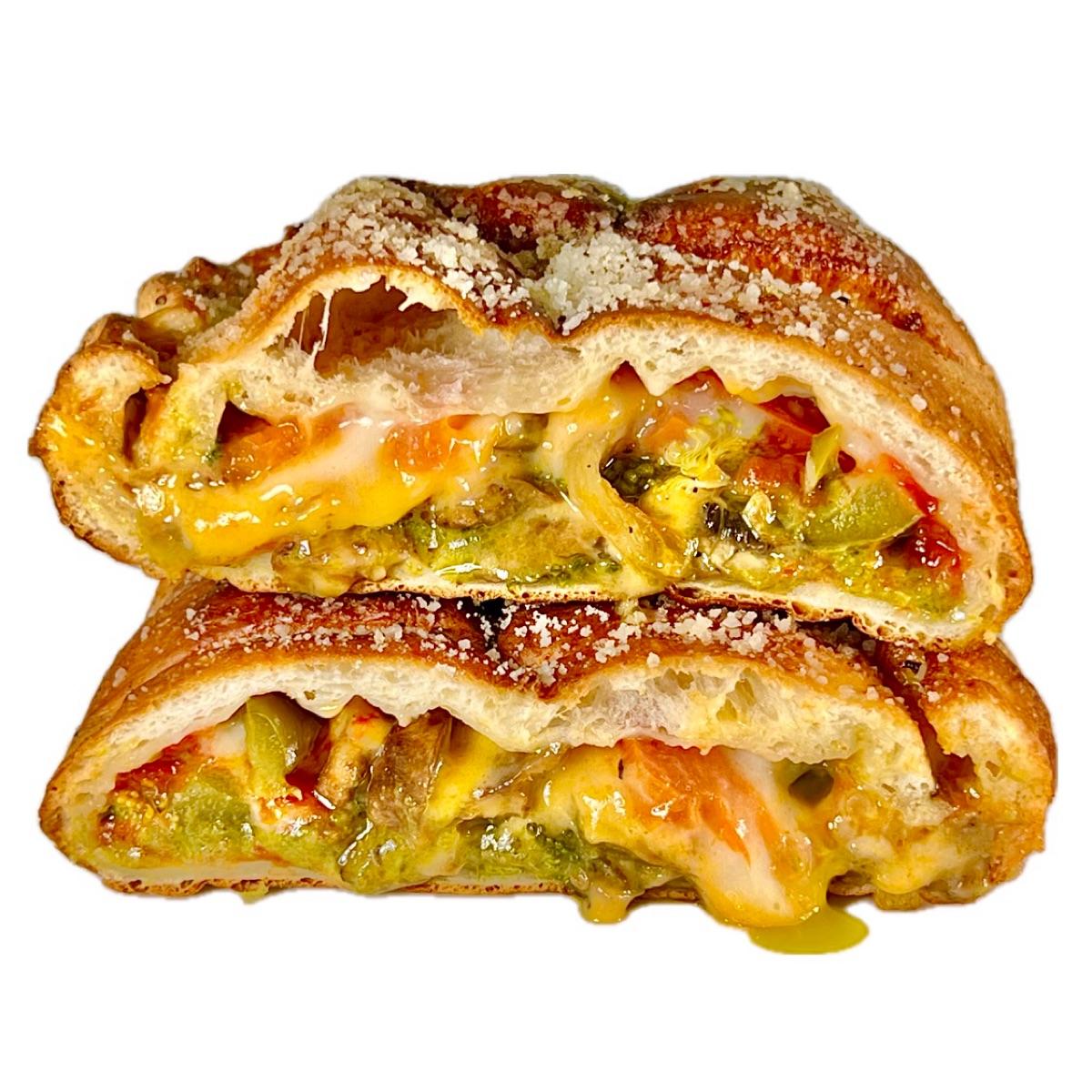 This consisted of broccoli 🥦, green peppers, garlic, juicy Roma tomatoes 🍅, white mushrooms 🍄🟫, luscious melty 🐄🥛-free Follow Your Heart cheddar and mozzarella, and vegan tomato pesto sauce all wrapped up in a pillowy dough with crisp edges. The crave-worthy combination of cheese and veggies was truly delightful.