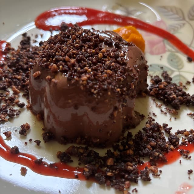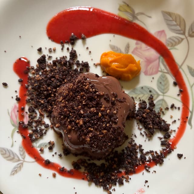 -Budino al cioccolato con coulis arancia e frutti rossi.