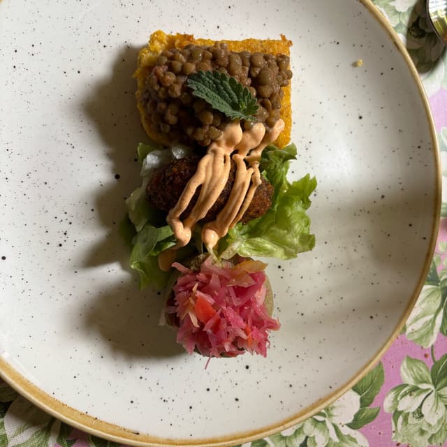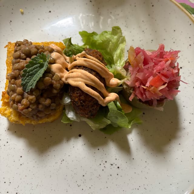 -Tortini di fave con cavolo fermentato, falafel, polentina croccante con lenticchie