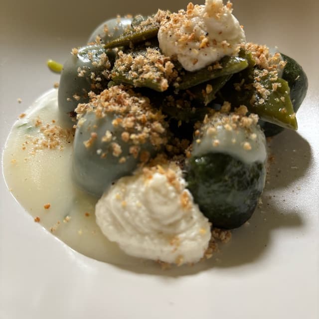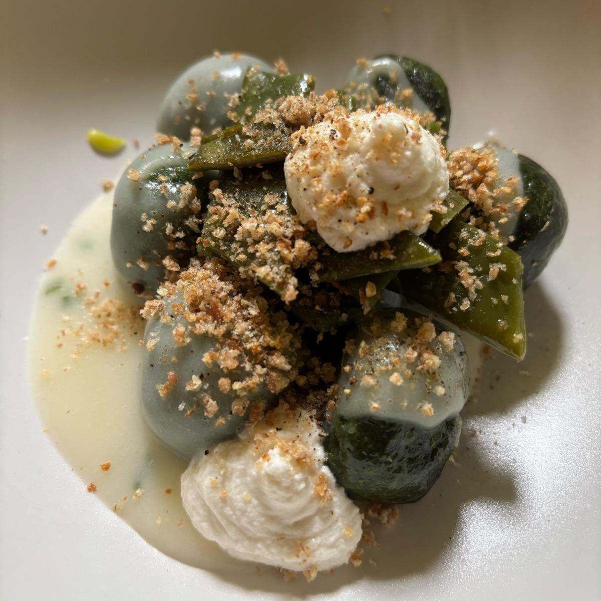 -Gnudi alle erbette con taccole e crema di formaggio veg