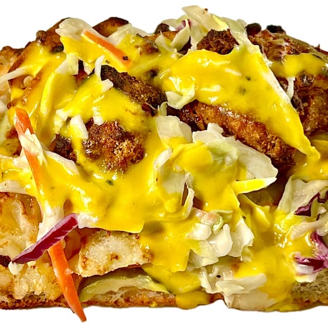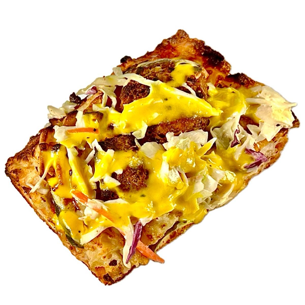 This consisted of luscious melty GOOD PLANet Foods 🐄🥛-free mozzarella/cheddar blend, lively, seasoned, crispy, meaty Buddy’s Steaks fried 🌱-based 🐥, waffle fries, pickles, coleslaw and 🐝-free honey mustard on a thick sourdough crust with crispy edges and a light and airy crumb inside. With a brilliant combination of meaty, cheesy, savory, sweet, and tangy, this had the best parts of a backyard BBQ in each bite. It is a special for Portland Pizza week, which continues through April 20, and a slice is only $4. It is also available as a whole pie ($16) and a gluten-free whole pie ($19.50)
