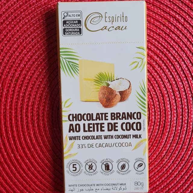 Chocolate Branco ao Leite de Côco, 33% de cacau, apenas 5 ingredientes, sem glúten, sem lactose, 100% natural e vegano. Delicioso!