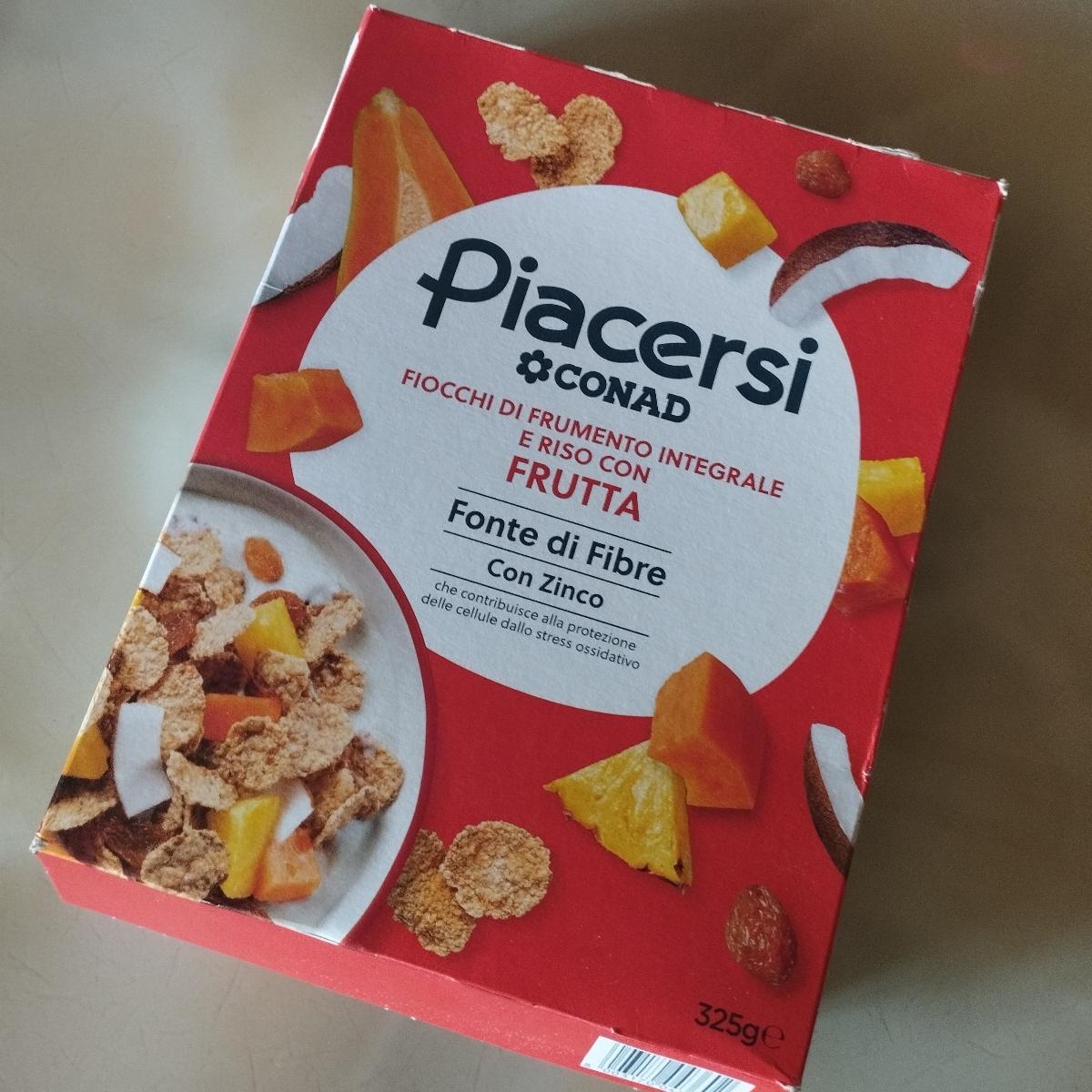 Fiocchi di frumento integrale e frutta ' Piacersi Conad ' acquistati presso Conad. Prodotto di buona qualità, ideale per colazione, lo consiglio #rifugiomiletta #santuariocapraliberatutti