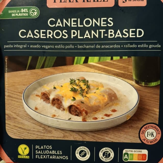 Ricos canelones caseros con pasta integral, asado vegano estilo pollo, bechamel de anacardos y rallado estilo gouda, rico en proteínas y sin lactosa.