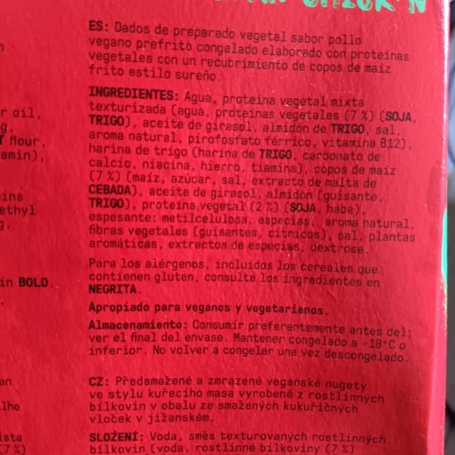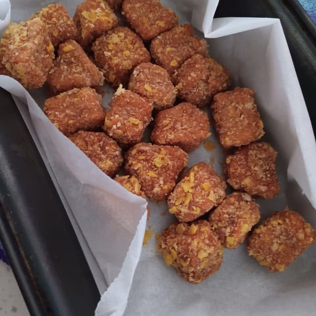 Daditos de no pollo con textura crujiente tipo pop corn para freír o hacer al horno.