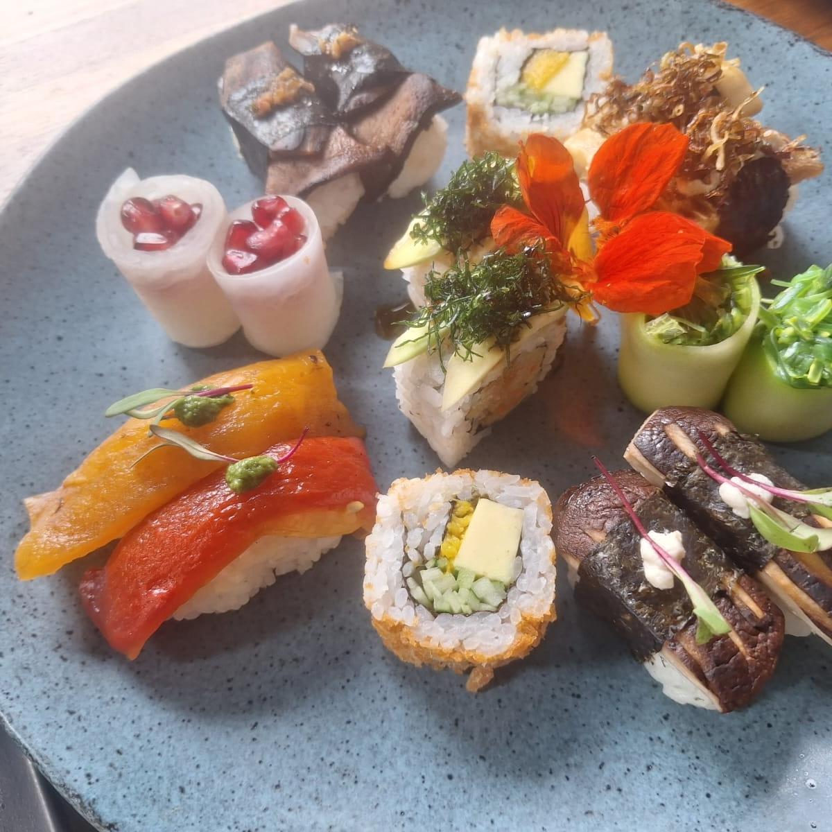 O combinado é totalmente vegano e variado, Sushis, Sashimis, Joes, Hots, acompanhados de molhos, é tudo muito saboroso.