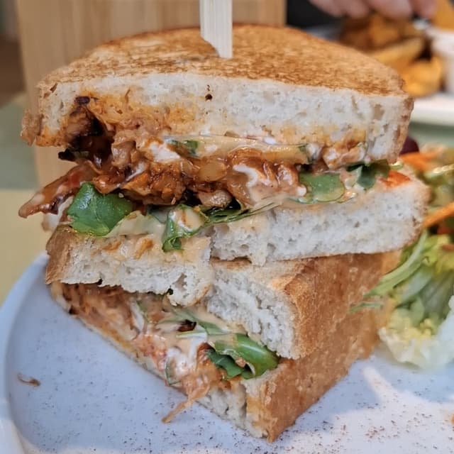 Questo è pane tostato farcito con Planted pulled pork, kimchi, rucola, maio e salsa shriracha, servito con insalata fresca di contorno. Mi è piaciuto, grazie alle salse e slla consistenza del pulled è molto umido e goloso. Non amo le cose piccanti ma per il kimchi faccio un piccolo sforzo - e in questo caso diverse pause tra un boccone e l'altro per placare l'incendio 🙃.
