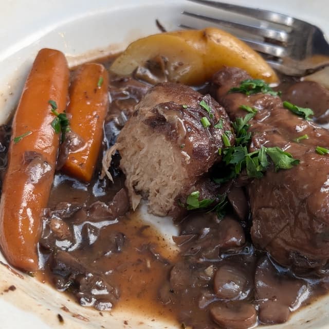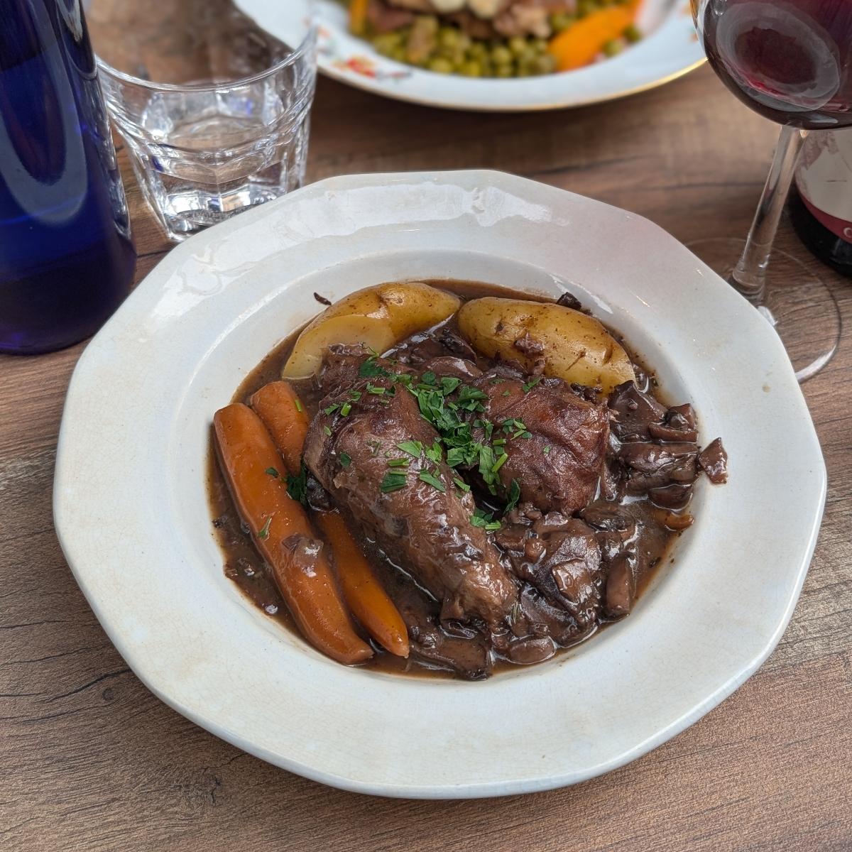 I've been looking at this menu for years, and for years this coq au vin has been calling to me. I never had the meat version, but how Delice & Sarrasin describes it sounded so good —Succulent "chicken legs" braised in red wine with Parisian mushrooms, onions, spices and herbes de Provence. I loved this so much! It's really hearty and delicious. It went with the Côtes du Rhône we were drinking. The "chicken" they used was so tender. It even had a skin on it. I'd be interested in trying to make something like this with Meati cutlets. I loved that it came with two of everything, so it was really easy to share. I'd recommend this vegan version of an iconic French dish!
