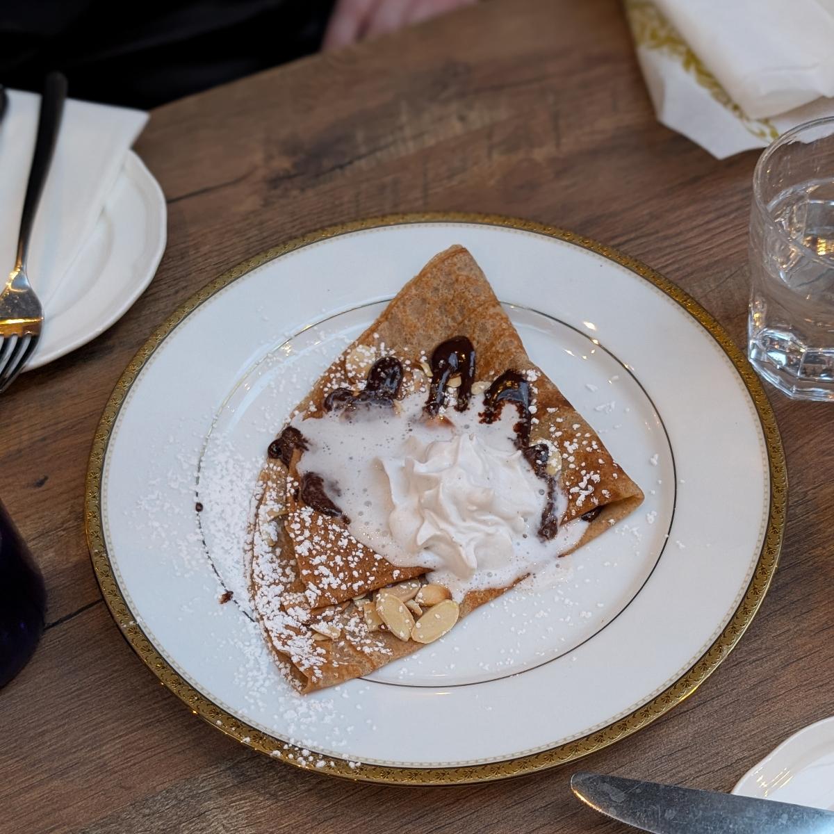 #crepe #almond #chocolate #chocoholic #whippedcream #powderedsugar #sweettooth #dessert #french #finedining #manhattan #newyorkcity #nyc