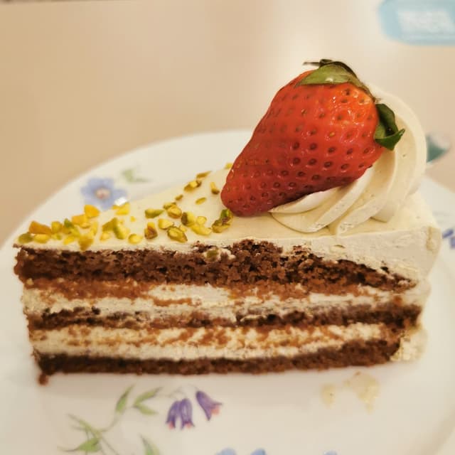 Ho iniziato da questa fetta di torta con pan di spagna al cacao e panna al pistacchio. Ero pronta all'ennesima delusione, invece il sapore di pistacchio si percepiva e risultava soddisfacente. Mancava invece il sapore di cioccolato, diciamo che il cacao del pan di spagna serve giusto per il colore.