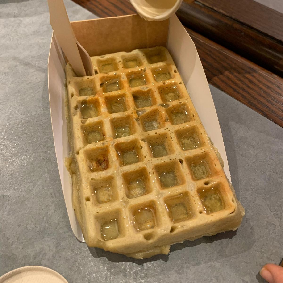 Gofre cubierto con sirope de agave. No me gustó mucho, estaría mejor con más condimentos, pero subía mucho el precio. Era vegano y sin gluten. Precio: 6€