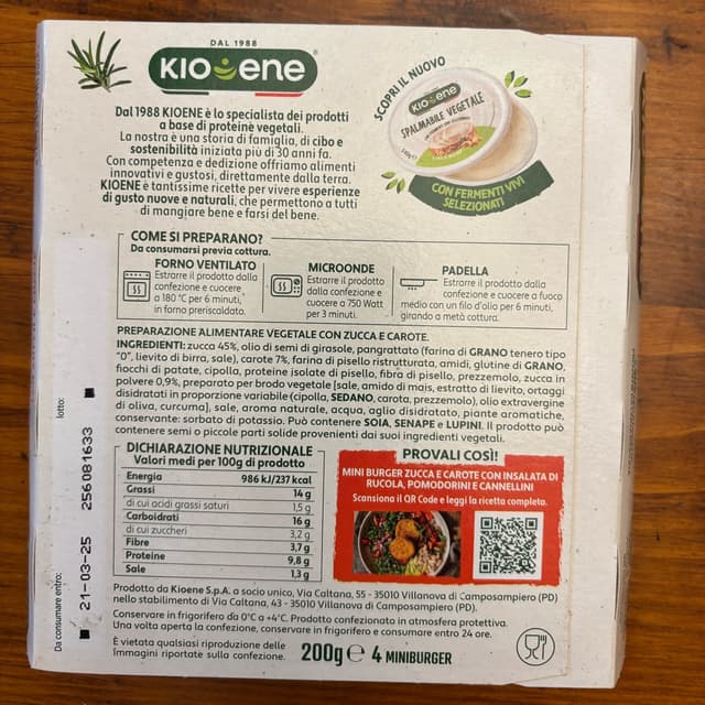 Mini burger di carote e zucca con farina di pisello ristrutturata. Immaginavo sarebbero rimasti mollicci ed infatti. Poi non mi piace proprio la simil panatura granulosa. Essendo fatto praticamente di sole verdure però ero partita prevenuta. Il gusto è buono perchè mi piace la zucca, ma non penso li ricomprerò.