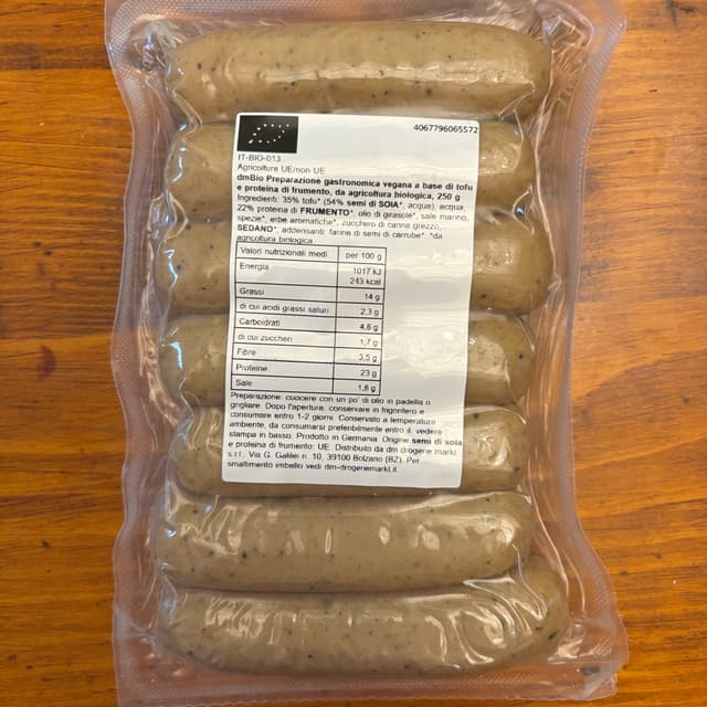 Salsicce a base di tofu e proteina di frumento della Dm. Che scoperta! Buonissime, temevo avessero un gusto strano (di solito non mi piacciono i simil salsiccia/wurstel) ma queste erano proprio buono. Anche la consistenza soffice e per nulla plasticosa. Gustose con la giusta dose di erbette aromatiche. Le riprenderò!