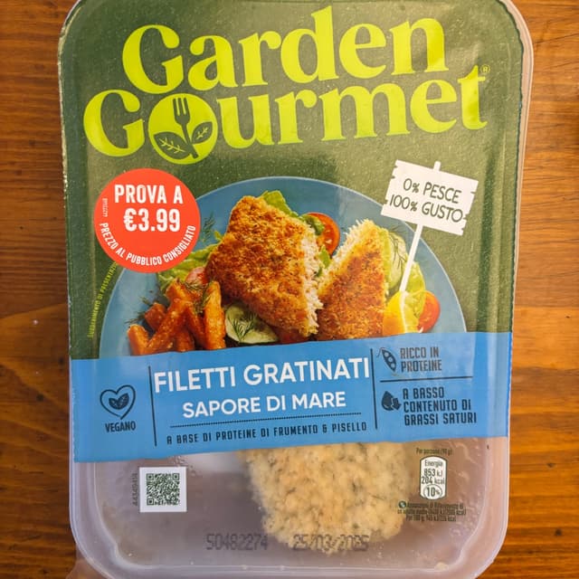 Filetti al sapore di mare a base di proteine di frumento. Premetto che non li ho mangiati io (odio il pesce) ma li ho presi per mio papà e mio fratello senza dire nulla per vedere se si accorgevano della differenza😂. In effetti non hanno detto nulla, penso avessero capito non fosse pesce ma l’hanno mangiato volentieri quindi significa che era buono. Missione compiuta! 🤩