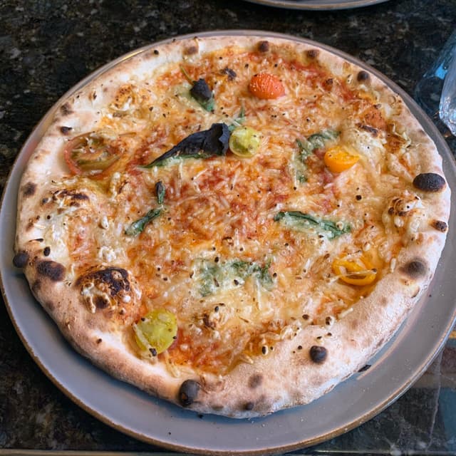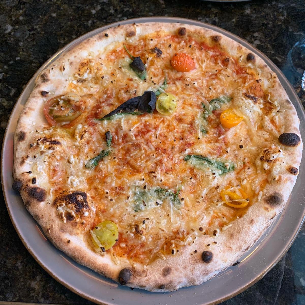 Descripción: Salsa de tomate con hierbas, mozzarella vegana, tomates cherry marinados, albahaca fresca. Precio: 12,9€.