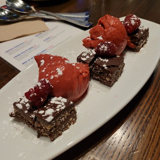 #chocolate #ganache with #coconutmilk, layered with toasted #coconut and #cashew, and #rasperry #sorbet.