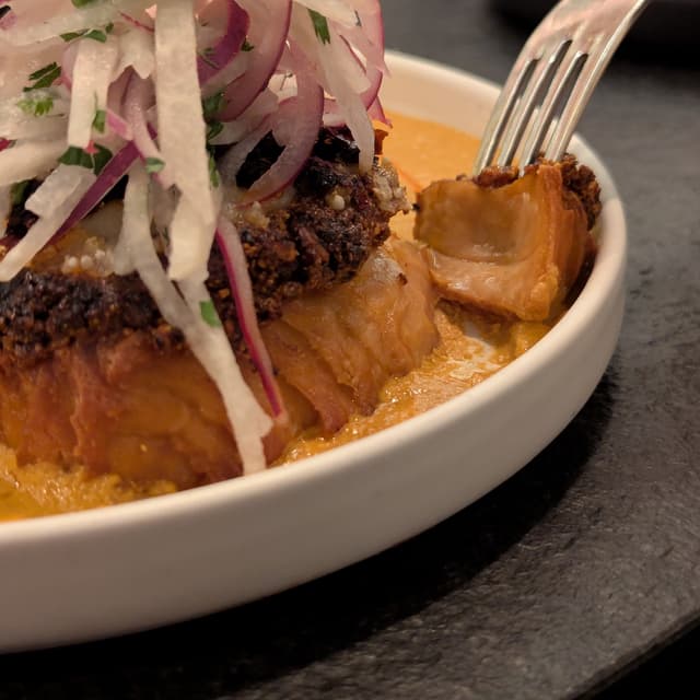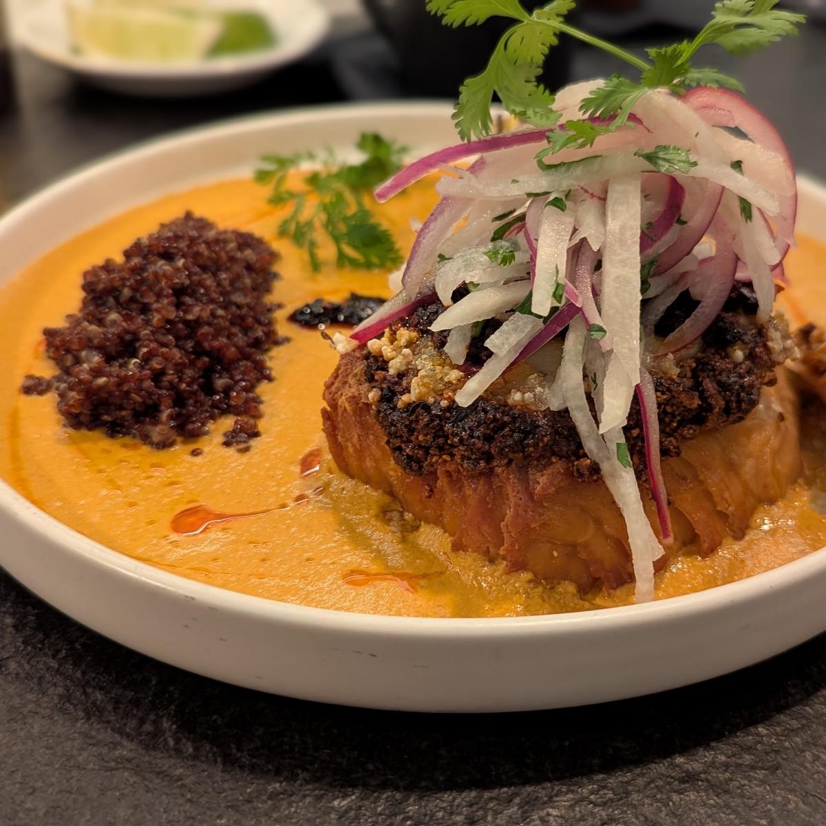 Sikil pak as the sauce to tie it all together is a masterful choice. The spicy nuttiness offered by the pepitas acts as the perfect grounding element to the salmon's aquatic flavors, while also bringing a little heat!