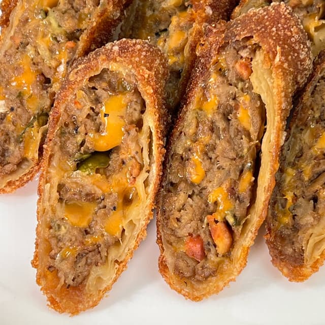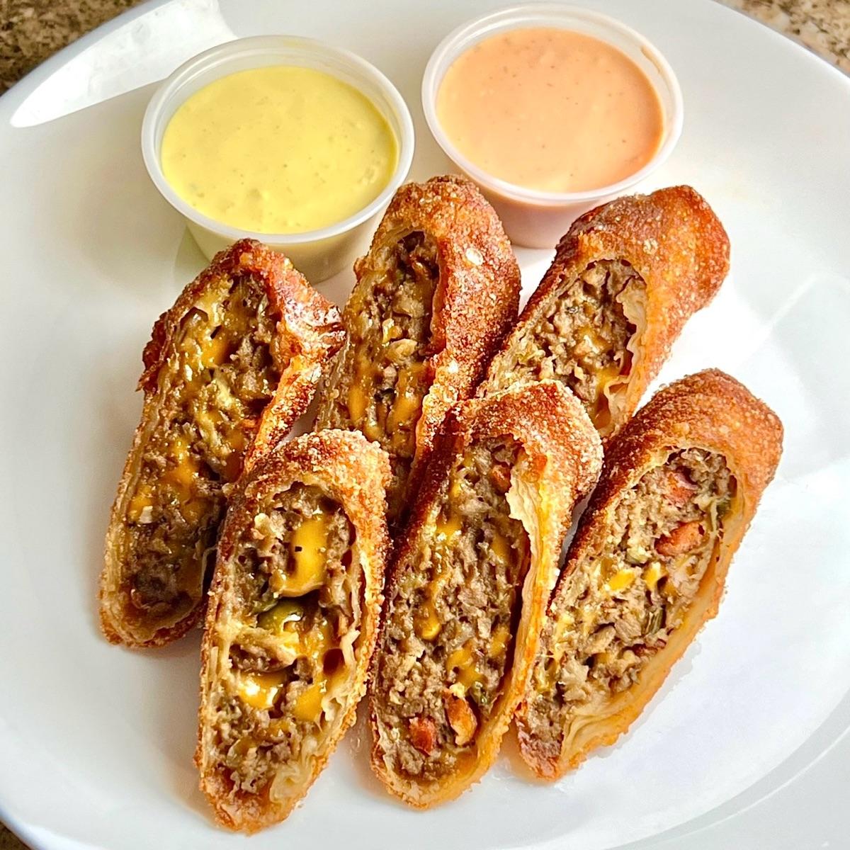 These consisted of 🐮-free burger meat made with Impossible Foods and Beyond Meat, smoky 🐷-free Thrilling Foods Bakon™, Vevan Food 🐄🥛-free cheddar, pickles 🥒, and grilled onions, all stuffed inside a crispy eggroll. Served with intensely flavorful dang and gnar sauces. They were incredibly delicious.