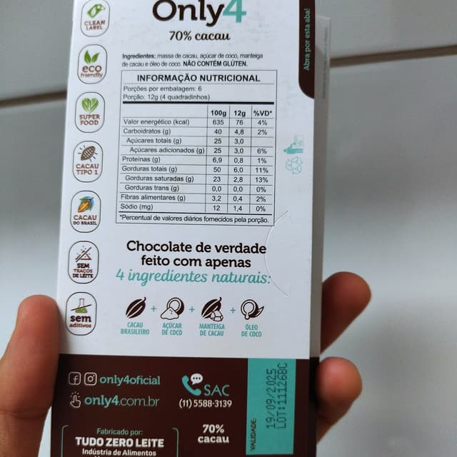 Chocolate ótimo, de empresa 100% vegana. Adoramos! Sabor intenso, daquele mais durinho pra quem gosta de chocolate 70%. Apenas 4 ingredientes, e bem conhecidos de todo mundo. Recomendo muito!