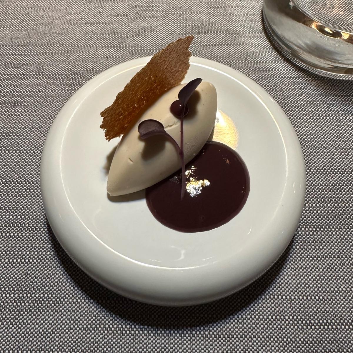 inaugurando il menù degustazione “tradizione e innovazione” con questa entratina. il sapore della quenelle di frutta secca affumicata era molto forte, quasi sgradevole MA si abbinava decisamente bene con la coulis (non ricordo se di lamponi o fichi) sotto. il tutto accompagnato da una cialda di pane croccante