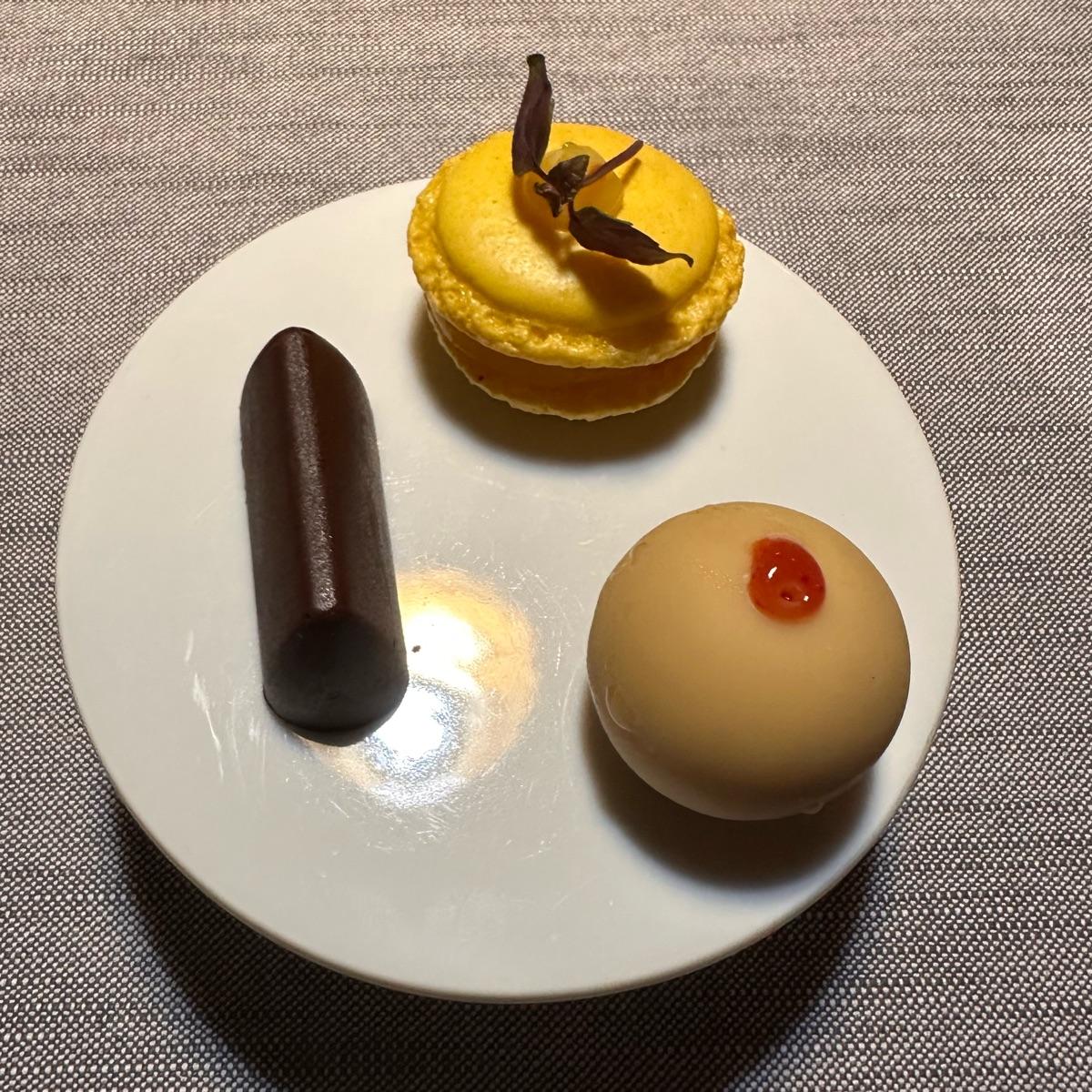 ultima portata del menu degustazione "tradizione e innovazione" con un gianduiotto di cioccolato fondente basic, un macaron di chantilly al limone molto buono e un ovetto di cioccolata bianca al sapore di fragola se non ricordo male.