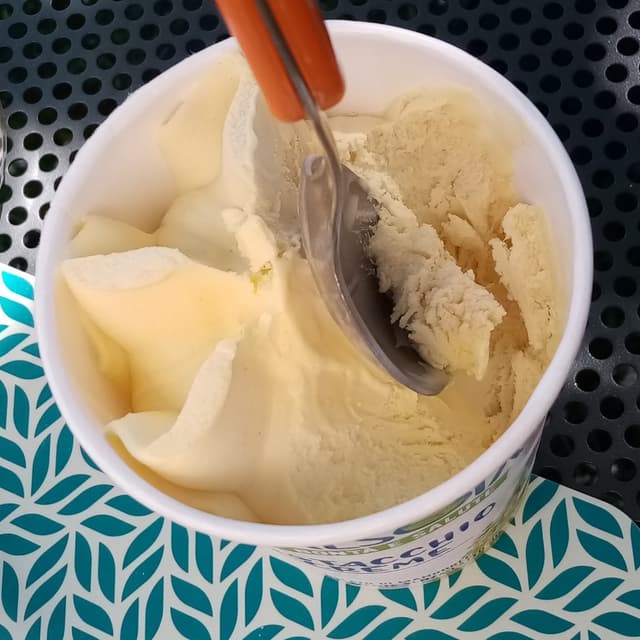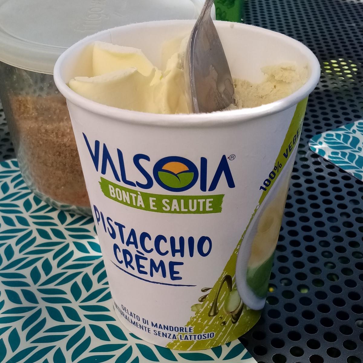 gelato metà crema e metà pistacchio 😋🍨 e la crema è buona ma niente di che, il pistacchio è bello intenso e cremoso, il tutto senza essere eccessivamente dolce, devo dire che almeno per i dolci la Valsoia sta migliorando molto 😉👍