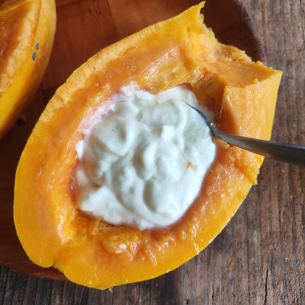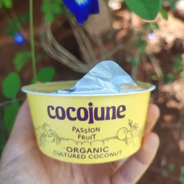 These#coconutyogurt cups from Cocojune are sooo small #gonetoosoon ! The passion fruit flavor with coconut yogurt is a winning combo though and I thought it would be nice with my papaya. Yummy 😋 #fruitlover