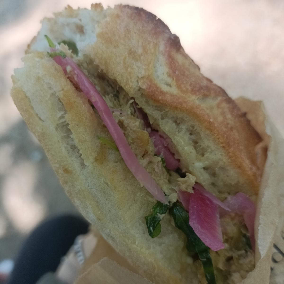 Baguette con tonno vegetale, cipolla, cetrioli, olive... Spaziale! Pane morbido e ingredienti ben bilanciati
