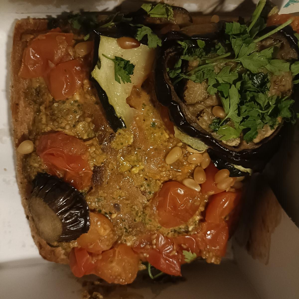 Impasto buonissimo, focaccia condita con pesto di pomodoro, melanzane, pomodorini, prezzemolo.. ottima!
