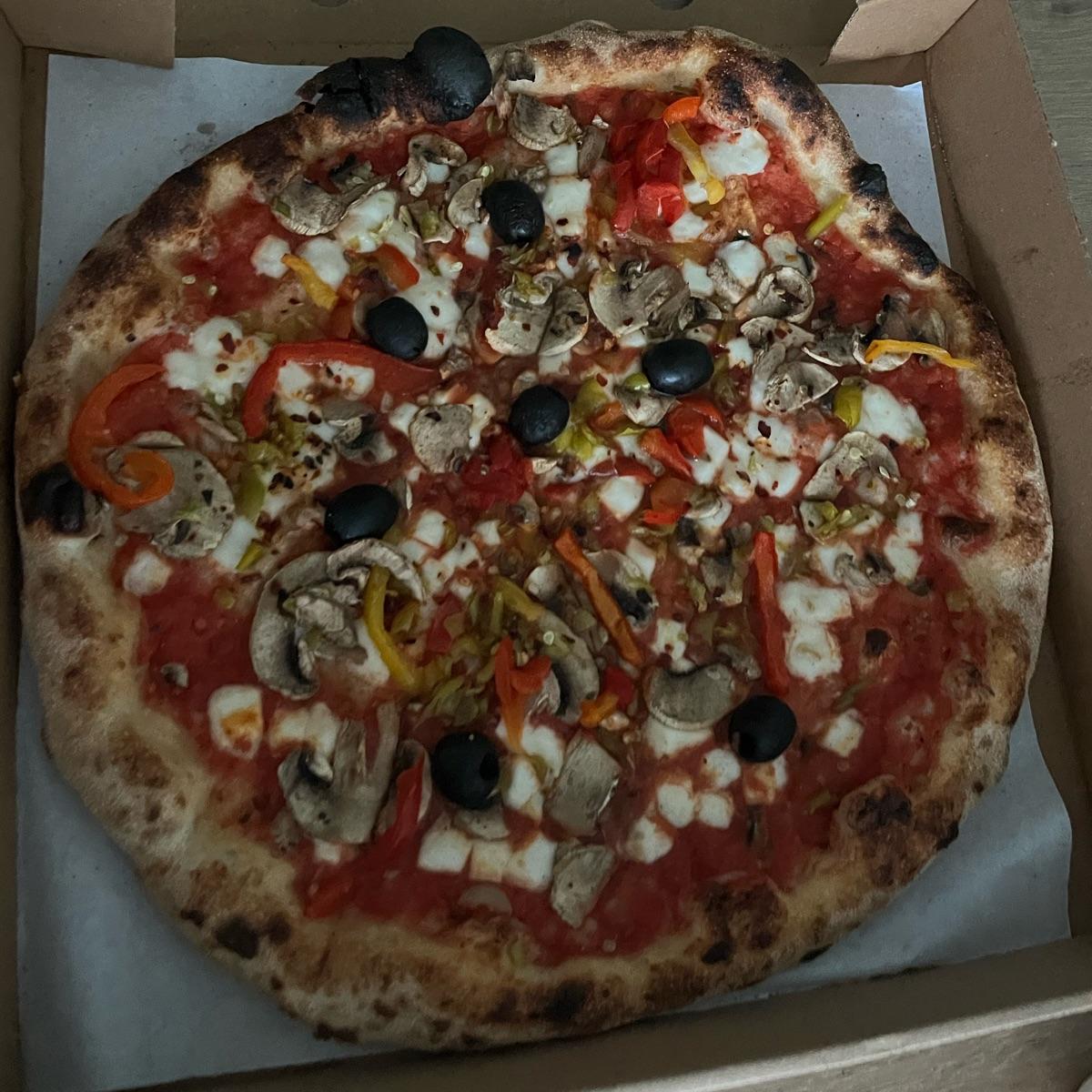 Spicy vegan pizza from yard sale - with mushrooms, peppers, olives, guindilla chillis and chilli flakes. Nice mix of veg and a good kick.
