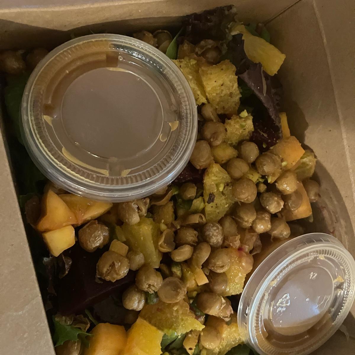 This hearty, tasty, and delightful salad includes mixed greens, roasted beets, sliced orange, pickle mango, pistachio, and yuzu dressing.
