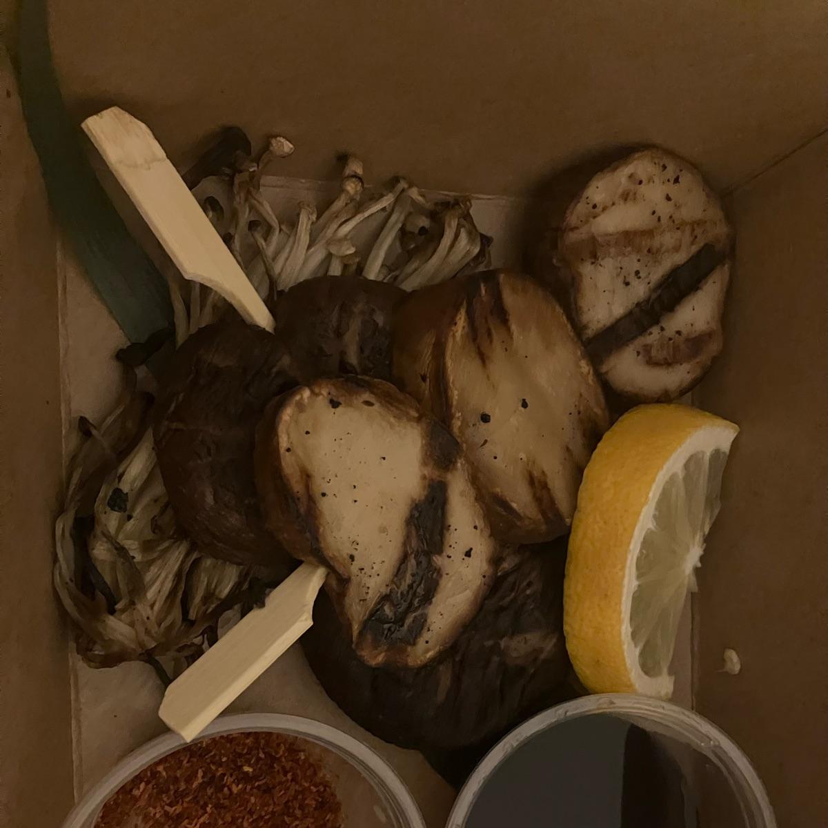 What a delightful and satisfying combination of tastes in this dish, described on the menu as ryngii, shiitake, enoki, and yakitori.
