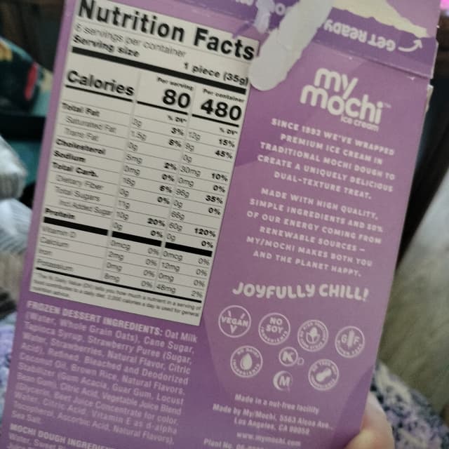 Decent little treat. It has a nice chew on the outside and refreshing strawberry oat milk ice cream inside.