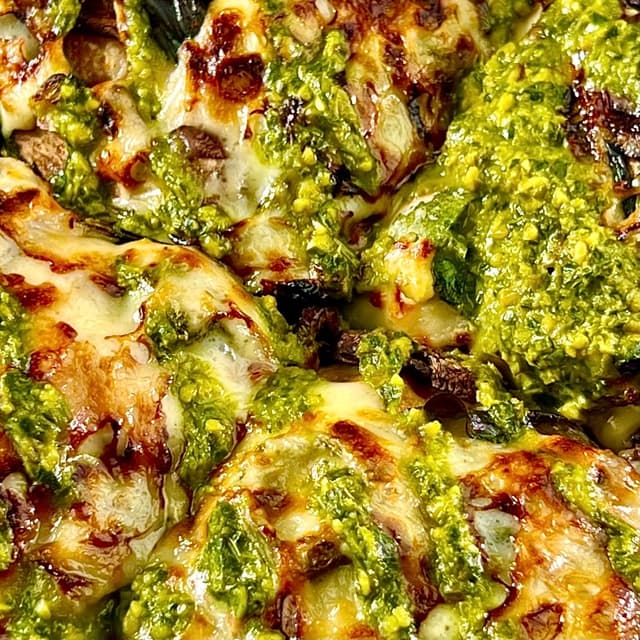 This consisted of luscious melty GOOD PLANeT Foods 🐄🥛-free mozzarella, garlic sauce, crimini mushrooms, spinach, jalapeños, and vibrant, chunky, herby pesto on a thick sourdough crust with crisp edges and a light and airy crumb inside. It had a fabulous combination of delicious flavors and can be made gluten-free.