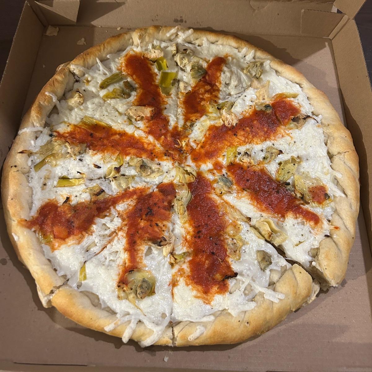 Another deception! They put the pizza sauce on top, I barely got a hint of the vegan organic “Roquefort” cheese. The only thing that made it tolerable was the artichoke bits you would sometimes run into. This pizza option is in their “Premium” section of the menu. Not premium at all, except for the price.