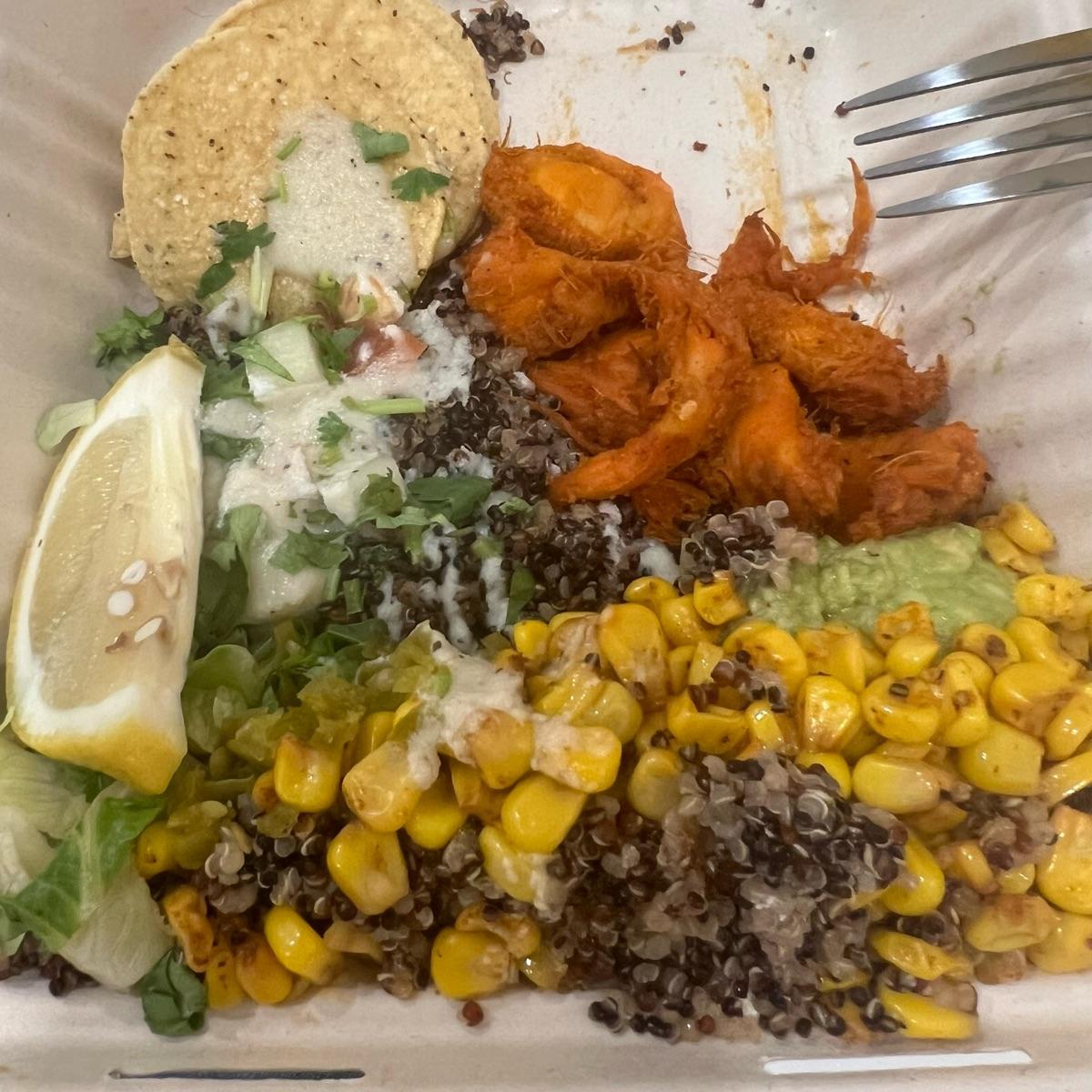 Lion’s mane mushroom 🍄🟫 pops, spicy 🌶️ smoked corn 🌽, herby lemon quinoa, guacamole 🥑, salsa, lettuce 🥬, jalapeño & tortilla chips.