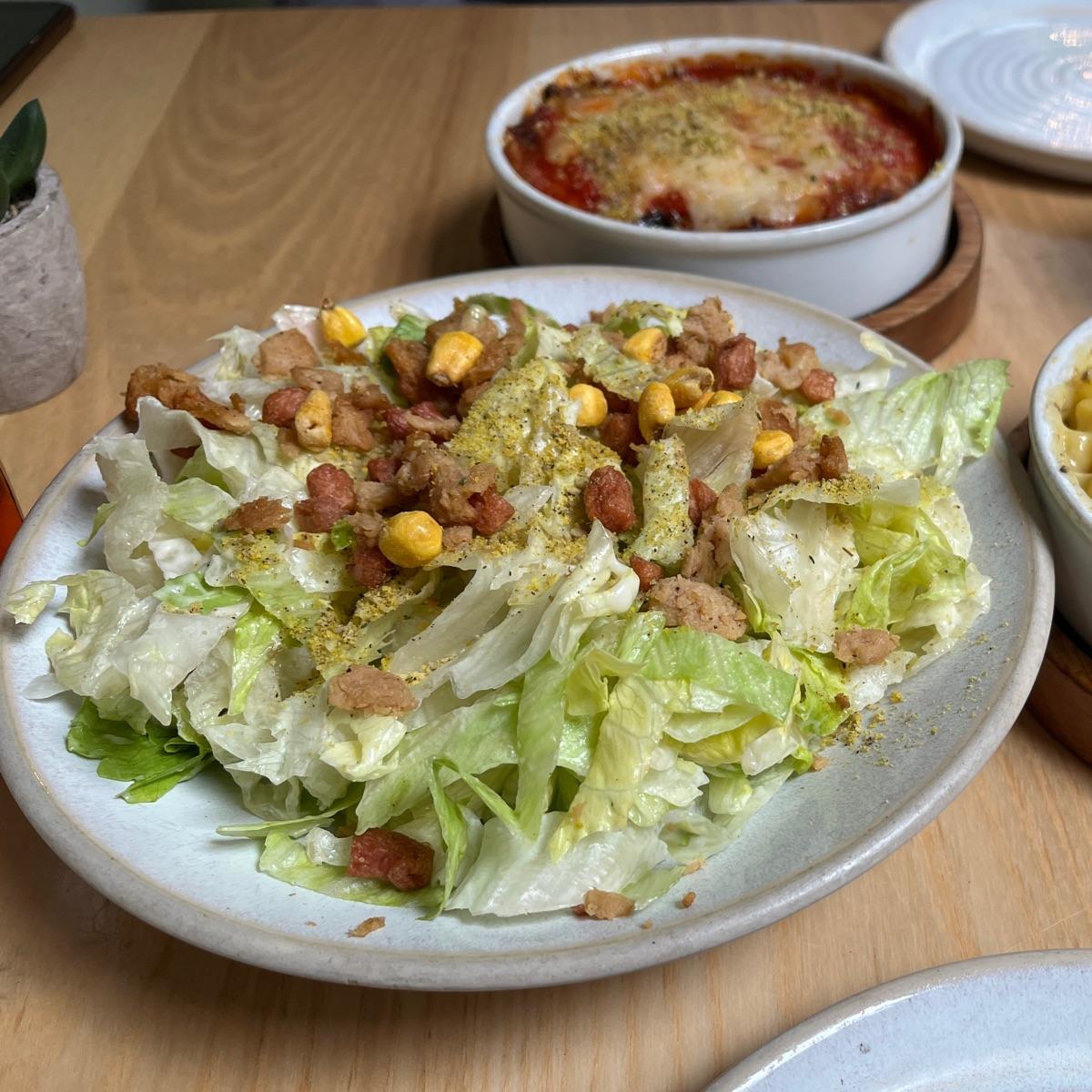 🥗 We tried their regular deal three sides for £18 which is great value so we could try new things. This #ceasarsalad #caesarsalad was nice. I was surprised they weren’t using romaine lettuce. Anyway it had great textures and flavors and we both enjoyed it. The crunchy corn was an unusual welcome topping too. Love this🌱 #veganrestaurant in #veganlondon. It’s a chain of #veganitalian pizza restaurants. I’d like to try more of their offerings. #londoneats #saveveganrestaurants