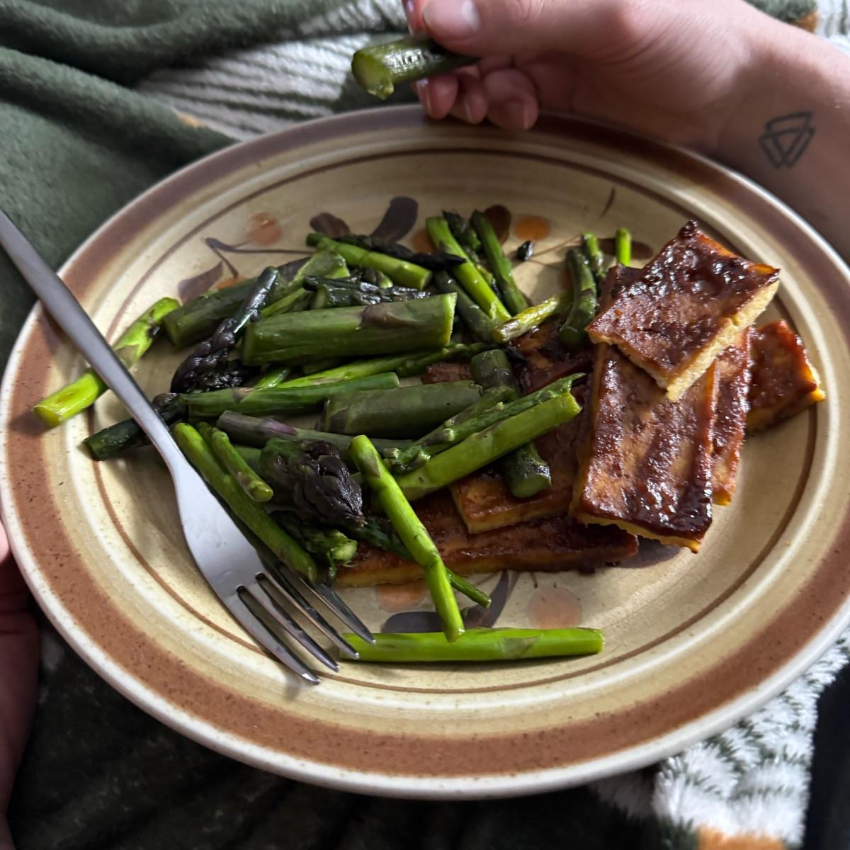 This tofu is pretty standard, but it’s a great price for the stores I have close to me. It always tastes the same and lasts well in the fridge. Here it is baked, 375°F for 25 mins, coated in a miso yuzu sauce, also from Whole Foods.