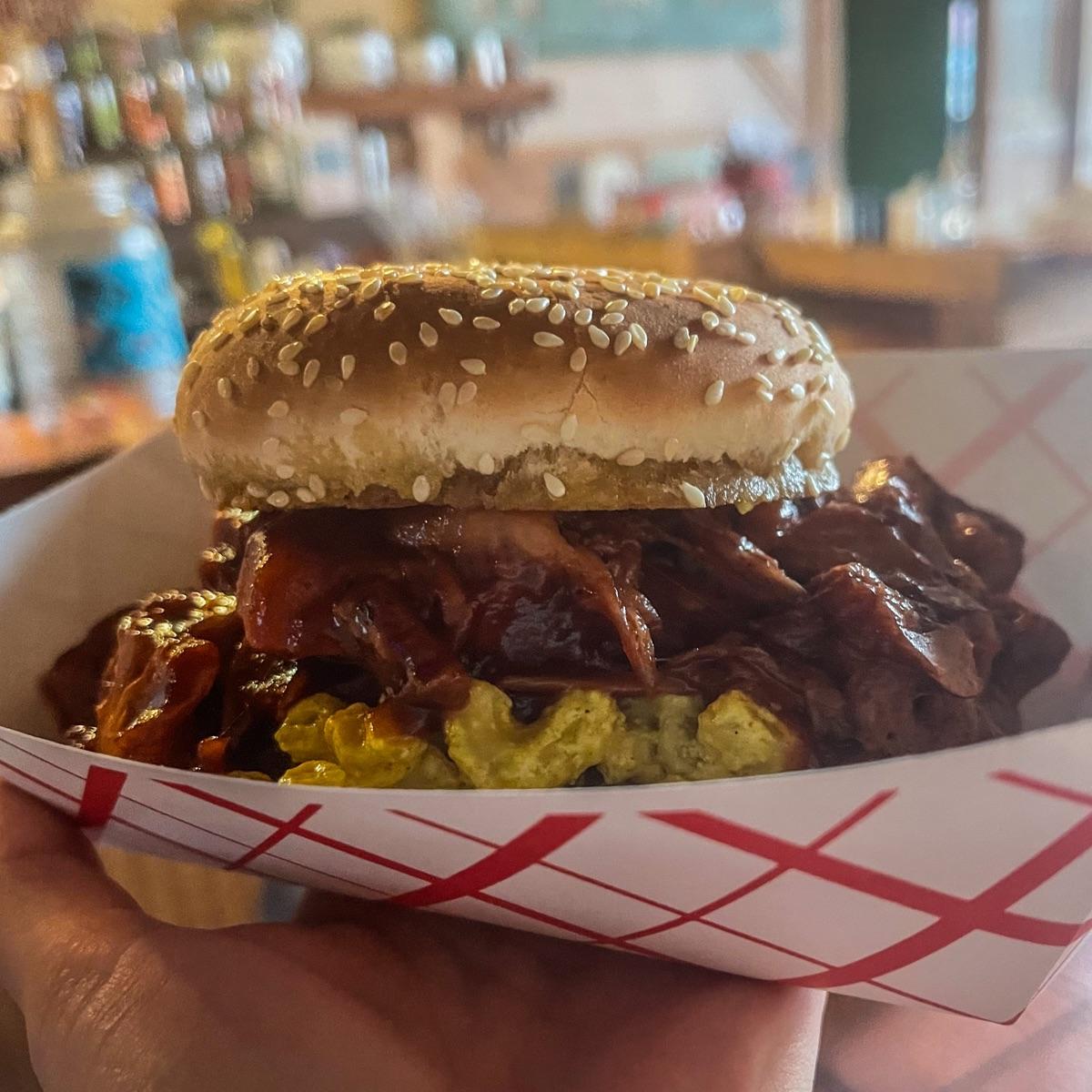 i hate writing bad reviews about vegan places but this one was attached to and owned by the same people as a non-vegan pizza place so honestly i don’t feel the worst. i was excited for this Porcnic sandwich because of all of the fun elements but thought the flavors and textures were disappointing. the jackfruit was the majority of the sandwich and was very basic, the bbq flavor was nice but i’ve had better jackfruit that resembled pulled pork more. the mac n cheeze was okay flavored, again i’ve definitely had a lot better, bit the color was probably the most neon mac i’ve ever seen. also i know it might seem picky but the bun was one of the worst choices for a sandwich like this, being just a regular seeded roll it got soggy fast and didn’t have the best taste. 🧀 #saveveganrestaurants