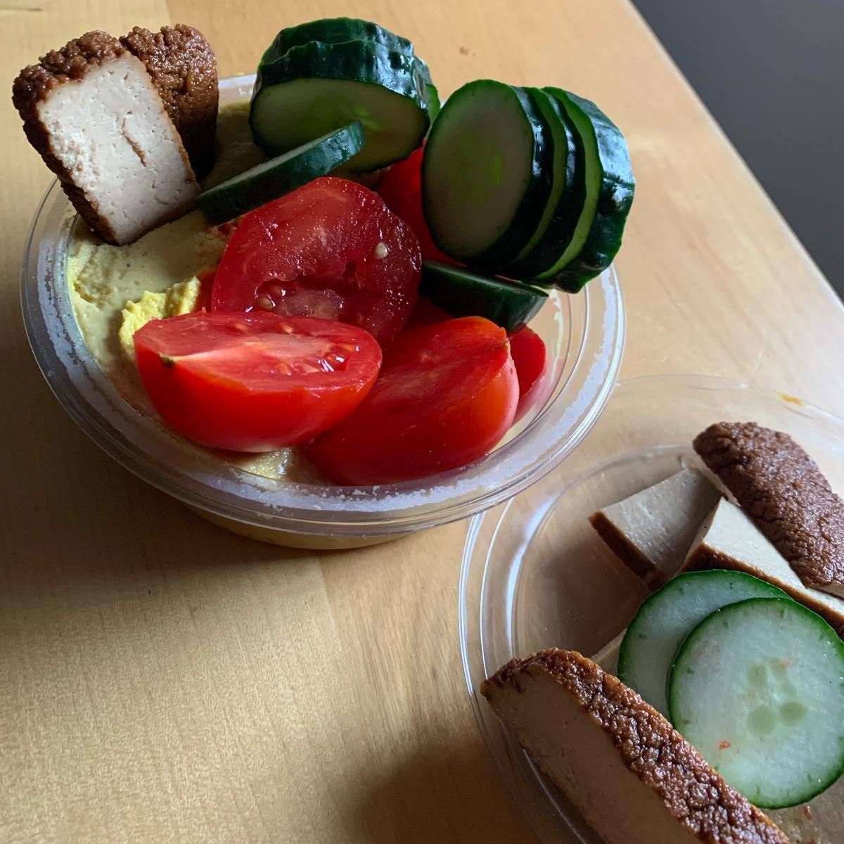 appreciated the #lazyveganmeal - a few slices of cucumber, pomodoro, & smoked tofu . . . quick prep and the only thing to wash was the knife. #lazyvegan
