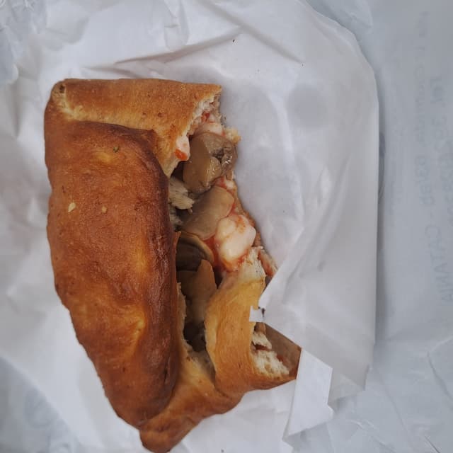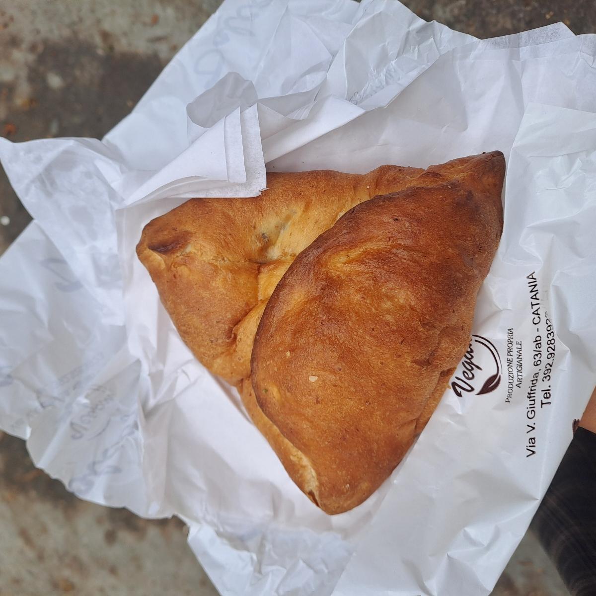 Non vedevo l'ora di andare a Catania per provare questo bar, di cui leggo sempre qui, e poi finalmente è arrivata l'occasione. E confermo che ne valeva la pena: ha diverse cose, sia di rosticceria che dolci. Questo panzerotto era squisito, impasto meraviglioso, il migliore che abbia mai mangiato, gustosissimo, buono anche il condimento : pomodoro, funghi e mozzarella vegetale precisa identica alla mozzarella, sfido qualcuno ad accorgersi che fosse rosticceria veg.. Tutto buonissimo.