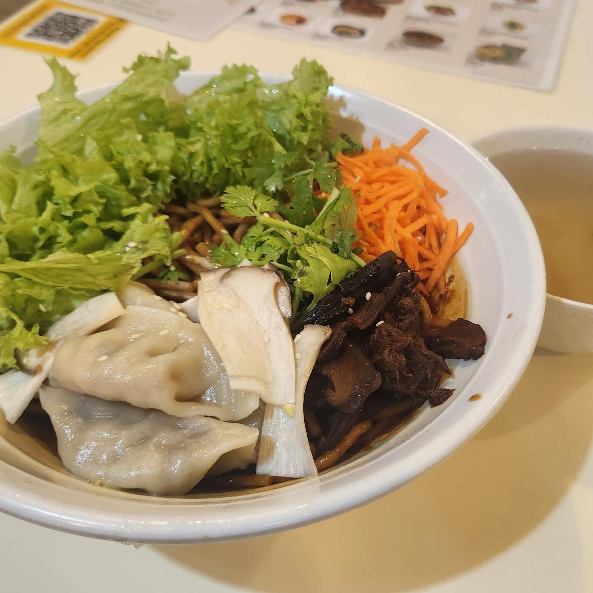 Simple dumpling noodles with tasty mushrooms and lots of greens!