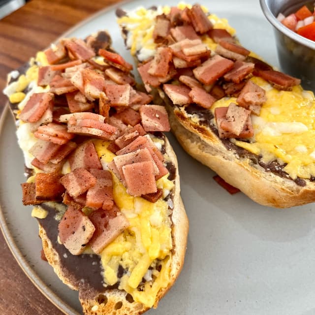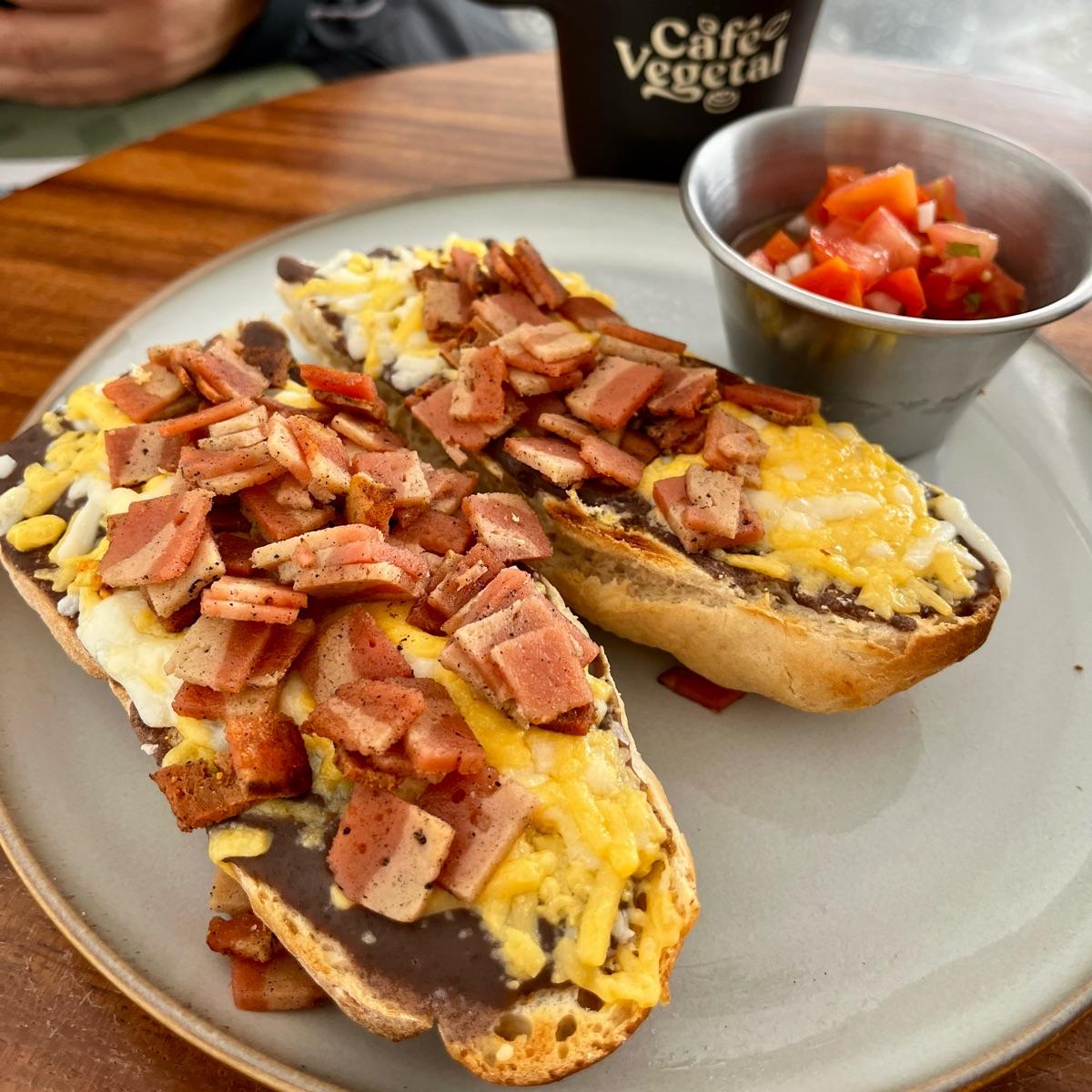 O que tal unos #molletes con #baguette de masa madre, mezcla de quesitos gratinados, tocino de trigo y frijoles negros con su inseparable pico de gallo. Otra delicia de desayuno que no te puedes perder. Puedes pedir los molletes sin topping o bien elegir entre tocino, chorizo, deshebrada de soya o berenjena adobada. Muy recomendables también. #govegan #veganiseasy #meatless #fakemeat #meatisscary