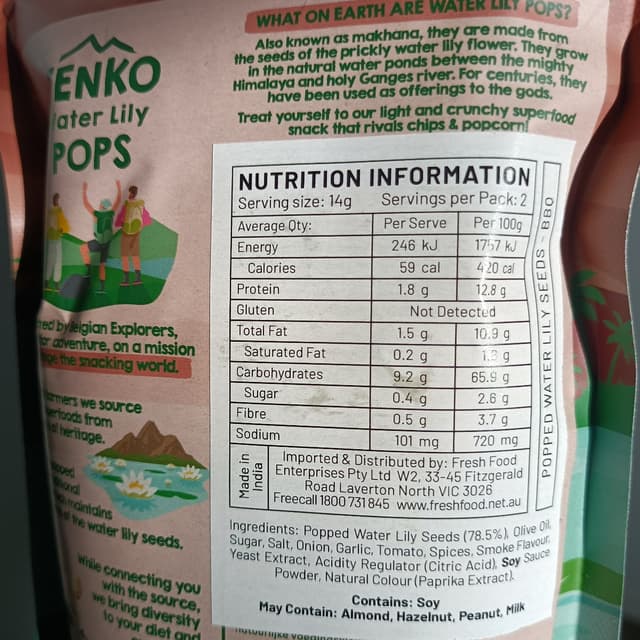 Clear vegan claim on the front. Wholefood Merchants stocks a bunch of stuff by these guys, and this was interesting mostly for what it's made of - water lily seeds. Taste is smoky and a teensy bit savoury. Overall: alright. #puffs #snack