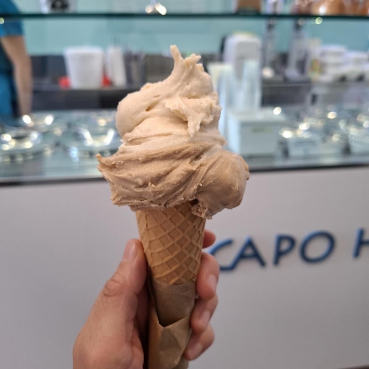 La nocciola si sente, anche se avrei preferito un gusto più intenso. Consistenza per me perfetta, vellutata e cremosa e non squaglievole in un batter d'occhio. Porzione generosa ma direi commisurata al prezzo abbastanza alto, soprattutto considerando che il cono non è sta gran qualità (è la parigina leggera).