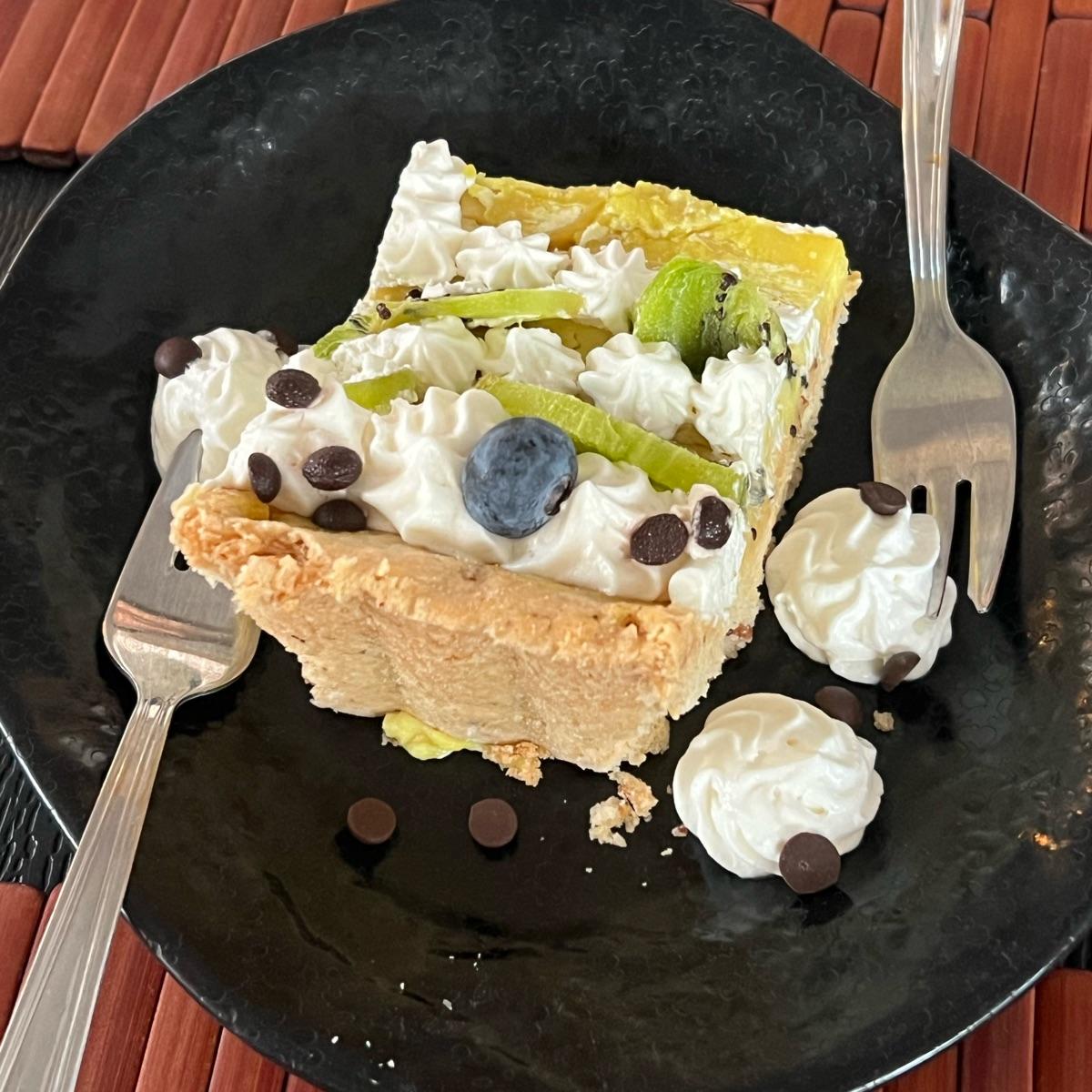 Crostata con crema pasticcera, panna e frutta fresca. Tra le migliori torte mangiate da Veganda.🍰