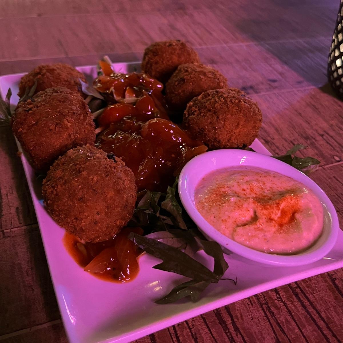 I love these. Very well made and flavourful rice and mushroom balls and the hummus was delicious. The "salsa" in the middle was actually sambal bawang, flavour of Malaysia.